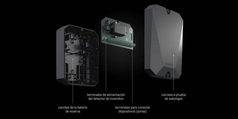 MultiTransmitter en sí se alimenta de la red de 110/230 V, y en caso de fallo eléctrico, hay un lugar para una batería de reserva en la carcasa que alimentará al módulo y los dispositivos conectados. La unidad central y los usuarios reciben notificaciones sobre cualquier problema de energía en la app Ajax.