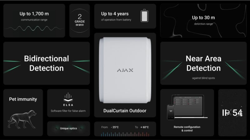 Aby zapewnić użytkownikom szybkie i dokładne wczesne wykrywanie wtargnięcia, opracowano DualCurtain Outdoor, bezprzewodowy zewnętrzny czujnik ruchu, który strzeże granic posesji. Urządzenie łączy w sobie dwie kurtynowe czujniki ruchu skierowane w przeciwnych kierunkach. DualCurtain Outdoor ma niespotykany zasięg wykrywania wynoszący 30 metrów i wykorzystuje opatentowane technologie firmy Ajax.
