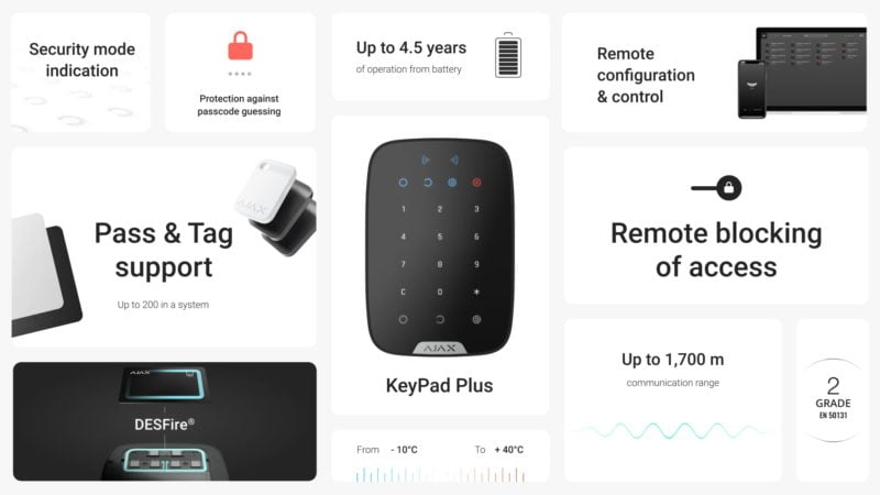 Aby maksymalnie uprościć zarządzanie systemem alarmowym, w klawiaturze zintegrowano funkcję identyfikacji zbliżeniowej. Nowy bezprzewodowy KeyPad Plus obsługuje szyfrowane urządzenia dostępowe: Pass oraz jego kompaktową wersję Tag. Aby zmienić tryb bezpieczeństwa, wystarczy zbliżyć urządzenie dostępowe do KeyPad Plus. Urządzenia są wyposażone w oryginalny czip DESFire®. Jest to najlepsza w swojej klasie technologia identyfikacji zbliżeniowej wykorzystywana w systemach transportowych europejskich stolic oraz w systemach dostępu NASA.