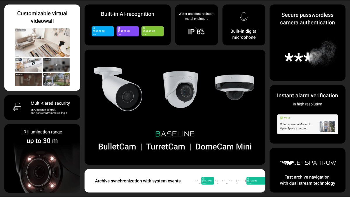 TurretCam, BulletCam, and DomeCam Mini embody signature Ajax design shapes. Each camera model is stuffed with one of four possible configurations: a lens with a viewing angle of 85 or 110 degrees and 3K or 4K resolution. Every Ajax camera easily adapts to changing light with True WDR technology. This smart tech, involving hardware and software, fixes uneven lighting in complex scenes, frame by frame, in real-time.