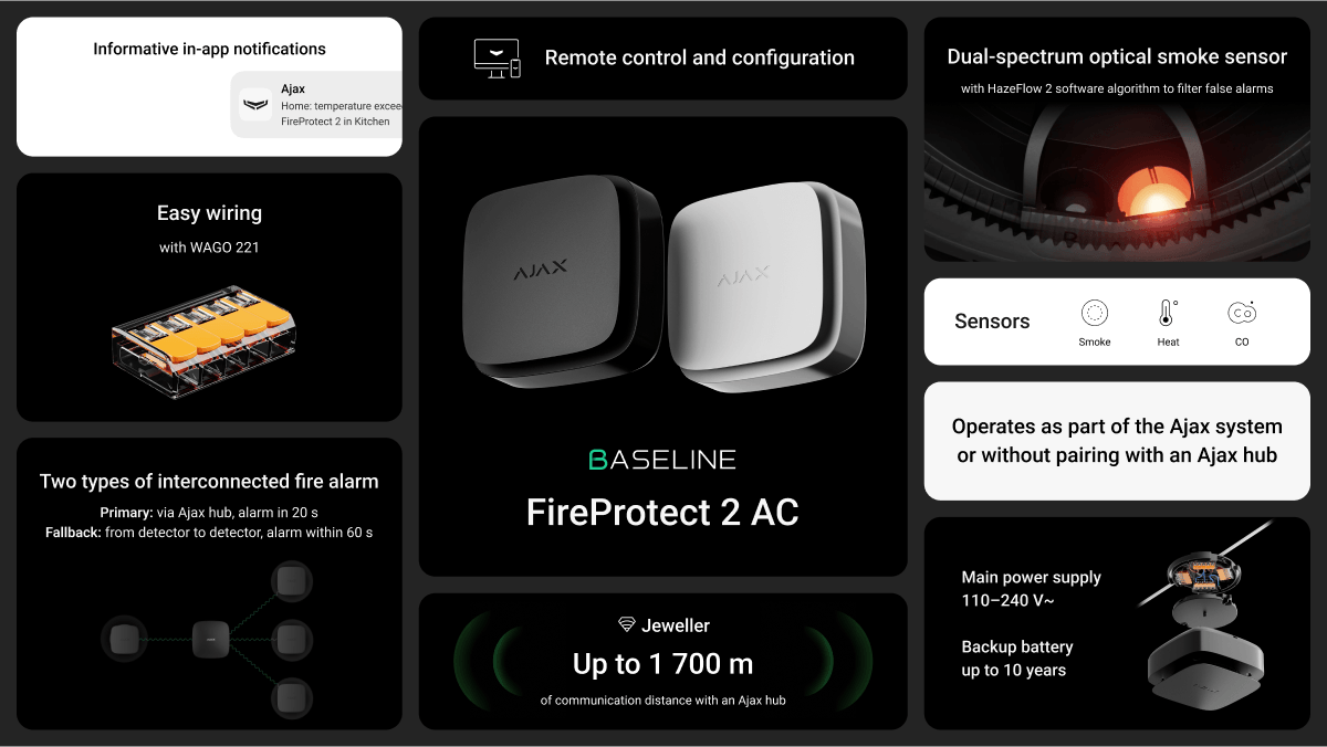 - Ajax also introduced new FireProtect 2 AC fire detectors equipped with a mains power supply. These AC detectors are designed with the latest advances in fire safety technology. They are catering to regions such as England, Wales, Australia, the US, and others, where all fire detectors, in most cases, should be connected to the mains.