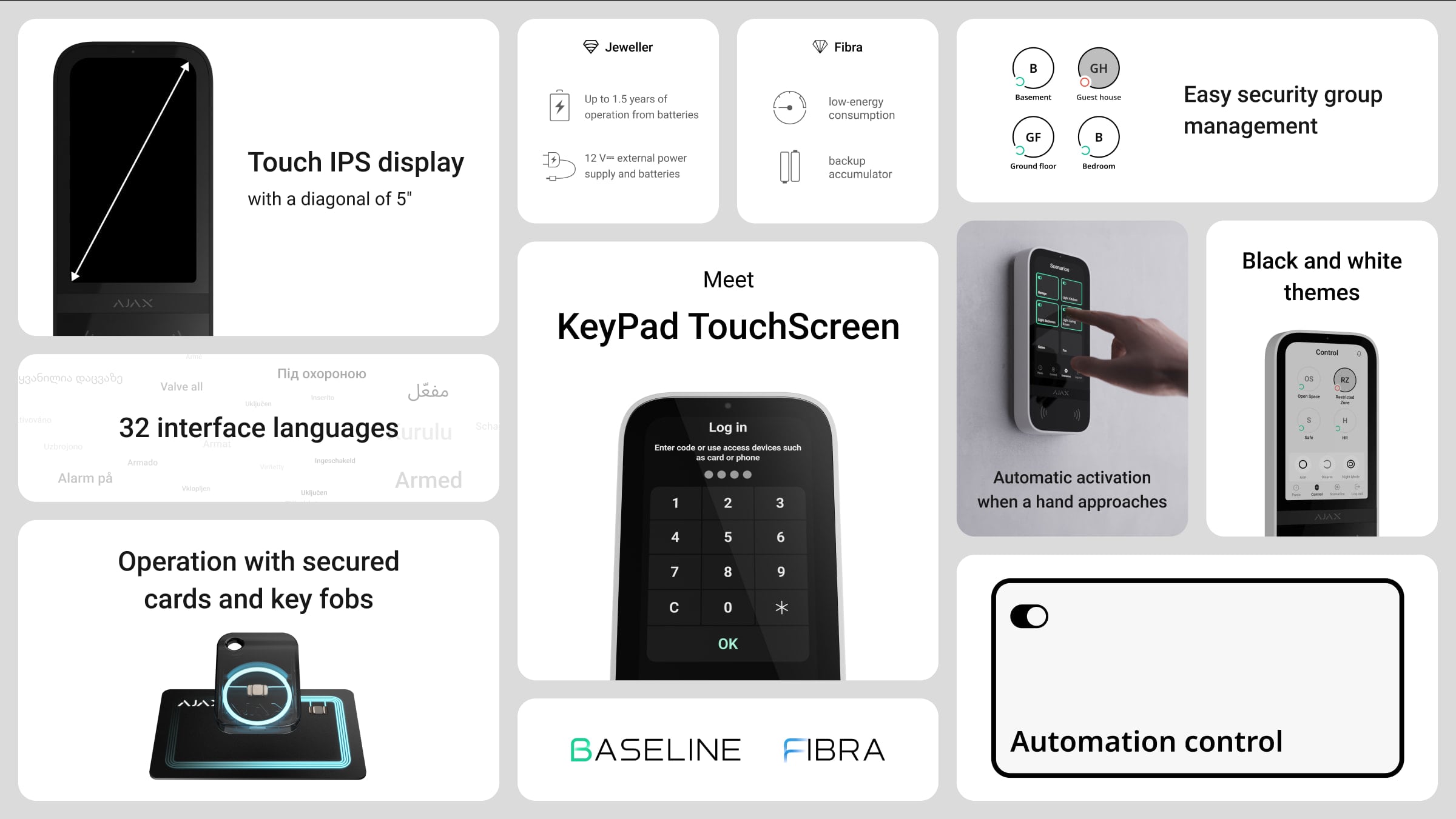 Wireless keypad with touch screen KeyPad TouchScreen offers a graphical interface where all important information is immediately visible. The device boasts an intuitive group management, familiar Ajax app-like interface, big touch IPS display, and top-of-the-line security features, including DESFire® technology and BLE (Bluetooth Low Energy) support which make it possible to control the keypad via smartphone with an Ajax app.