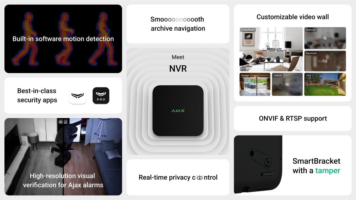 The synergy of Ajax systems and video surveillance will be delivered by Ajax NVR — network video recorder. It offers integration with Ajax video management system (VMS), ensuring seamless synchronization with the entire Ajax ecosystem, and allows wide compatibility with most IP cameras. NVR is available in 8 and 16-channel versions, providing instant access to video archives through the JetSparrow streaming technology with TLS encryption.